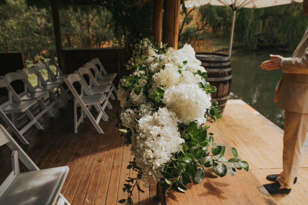 This package includes the use of 32 white Americana chairs, a selection of wine barrels, a signing table and chairs dressed in white linen, a chilled water station for guests on arrival and use of our estate for your wedding rehearsal.